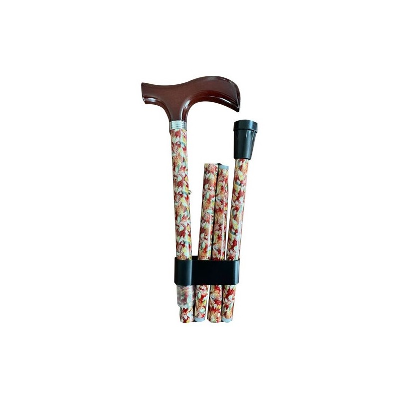 Bastón Pleglable y Ajustable con Diseño de Hojas Otoñales, Tubo de Aluminio y Empuñadura de Madera