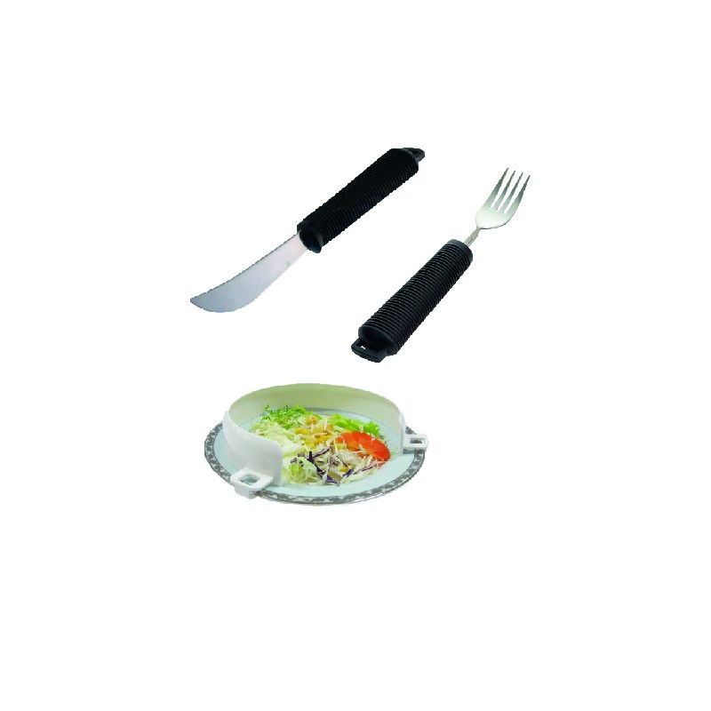 Es un Contorno Curvo de plástico que se pone sobre cualquier plato hondo o bajo. Con él nunca más se caerá la comida del plato, ya que sirve como baranda. Especialmente diseñado para personas con movilidad reducida en sus manos, porque les permite comer tranquilamente sólo con una mano.