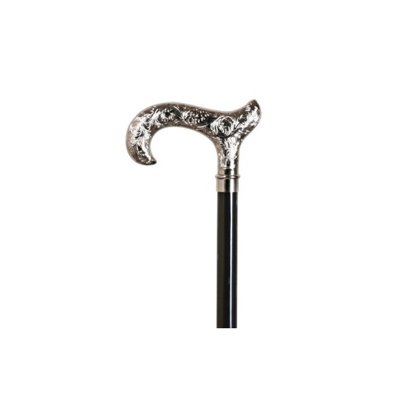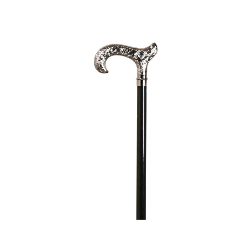 Este bastón está fabricado de madera haya. La empuñadura está niquelada con un lindo grabado y el palo es de color negro.