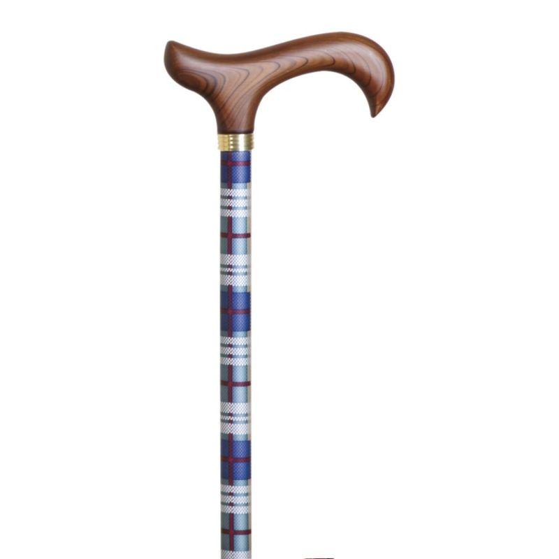Bastón extensible de tubo de aluminio estampado con cuadros de colores y empuñadura de madera, regulable en su altura. Fabricado en España