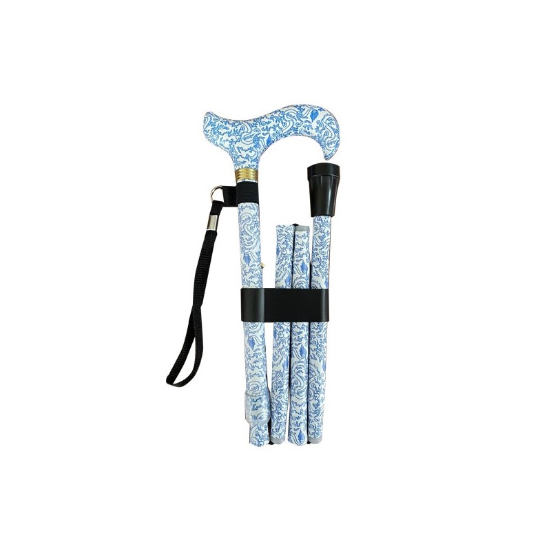 Bastón Plegable y Ajustable en su Altura, con Diseño de Flores en Azul y Blanco. Fabricado en Aluminio con Contera de Goma. Fabricado en España.