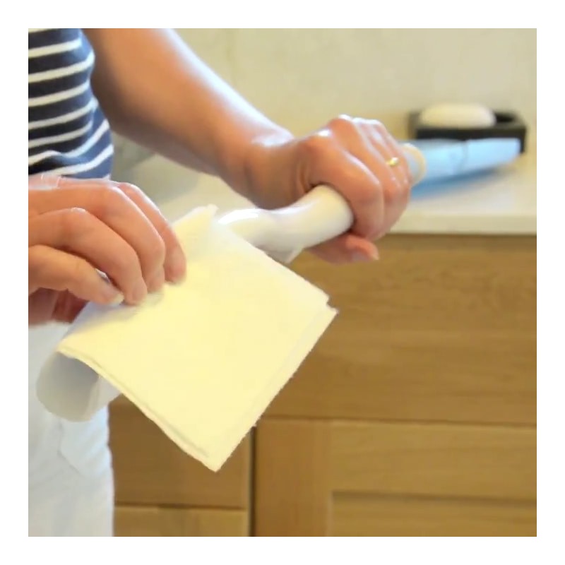1.- Seleccione la longitud del papel higiénico, que deberá ser alrededor de 6 hojas aproximadamente. Doble el papel por la mitad e introdúzcalo en hueco de silicona del Easywipe. Coloque el papel higiénico alrededor de la parte superior de silicona e introduzca el extremo que está suelto dentro del mismo hueco de silicona (envolviendo el extremo de silicona). De esta forma estará listo para realizar su limpieza íntima.