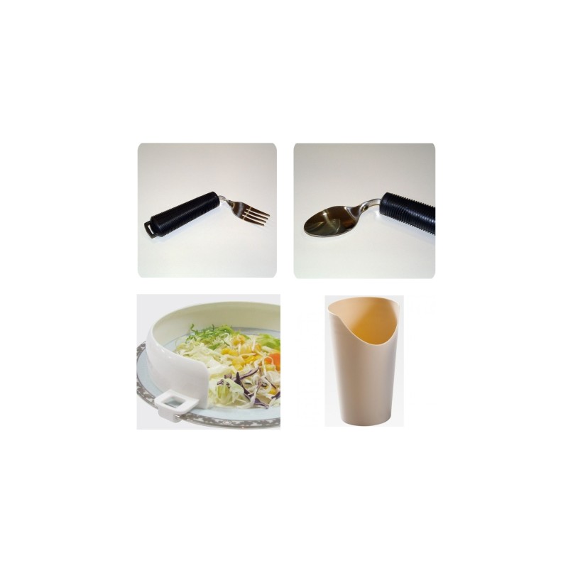 Pack de productos ergonómicos orientados para personas con dificultad de movimientos que incluye un vaso con escotadra, una cuchara, un tenedor y una guía para plato. Especial para pacientes de ELA o Parkinson.